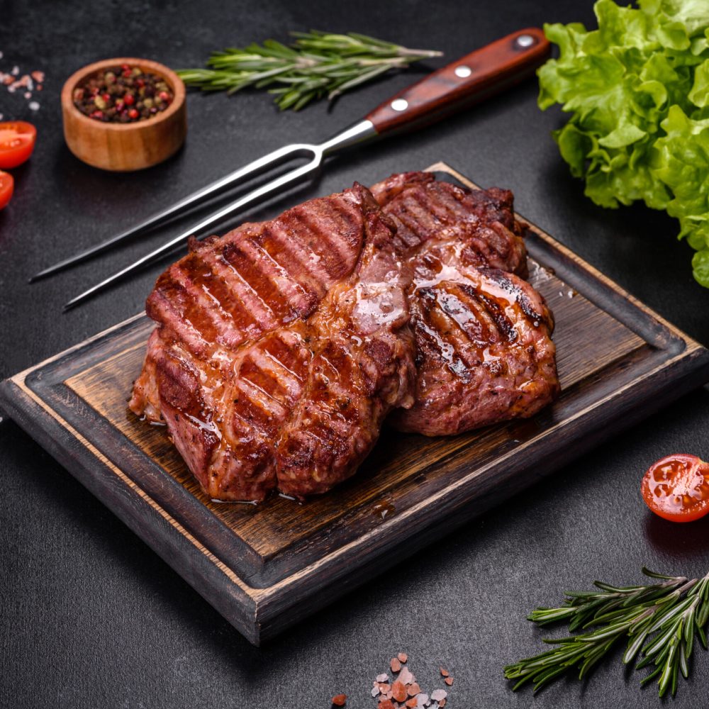 Grillade de bœuf Maître d’hôtel avec frites et salade OU Pizza du jour OU Salade composée